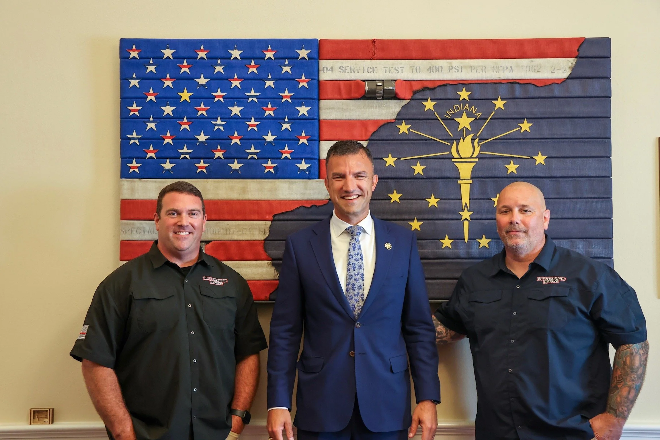 The story began when Congressman Yakym spotted a Brotherhood Designs flag hanging in Congresswoman Erin Houchin's Capitol Hill office. Her IN-9 flag was Indiana's first BDC piece in Washington. The Congressman's chief of staff reached out, and the District 2 project was born.