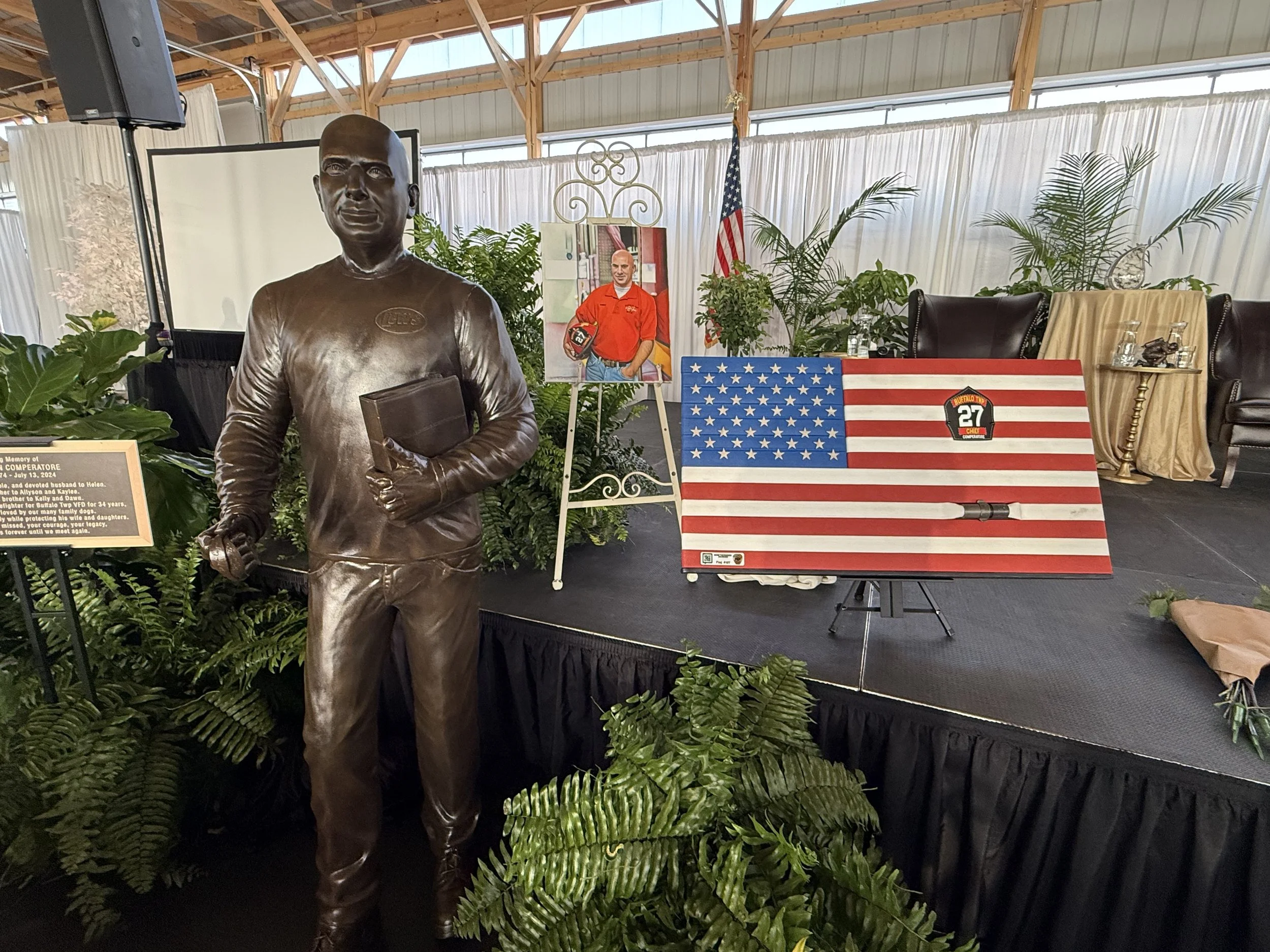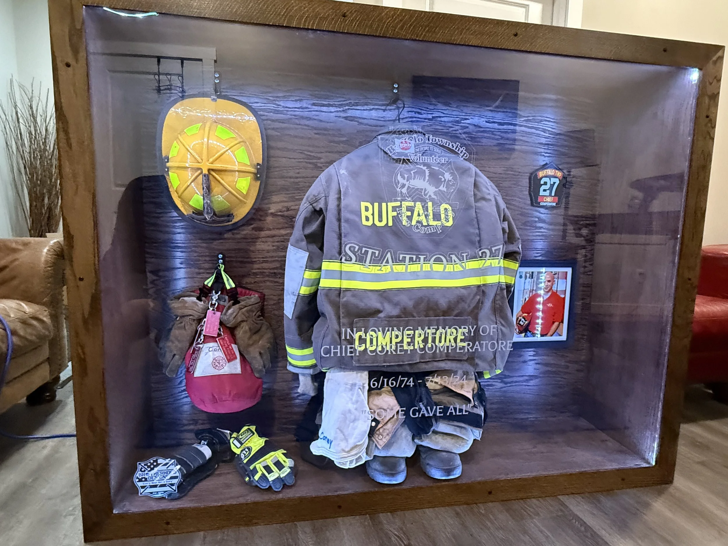 Custom display case honoring Chief Corey Comperatore presented by Brotherhood Designs to Helen Comperatore at Corey’s Cruise Memorial on 7/12/25.